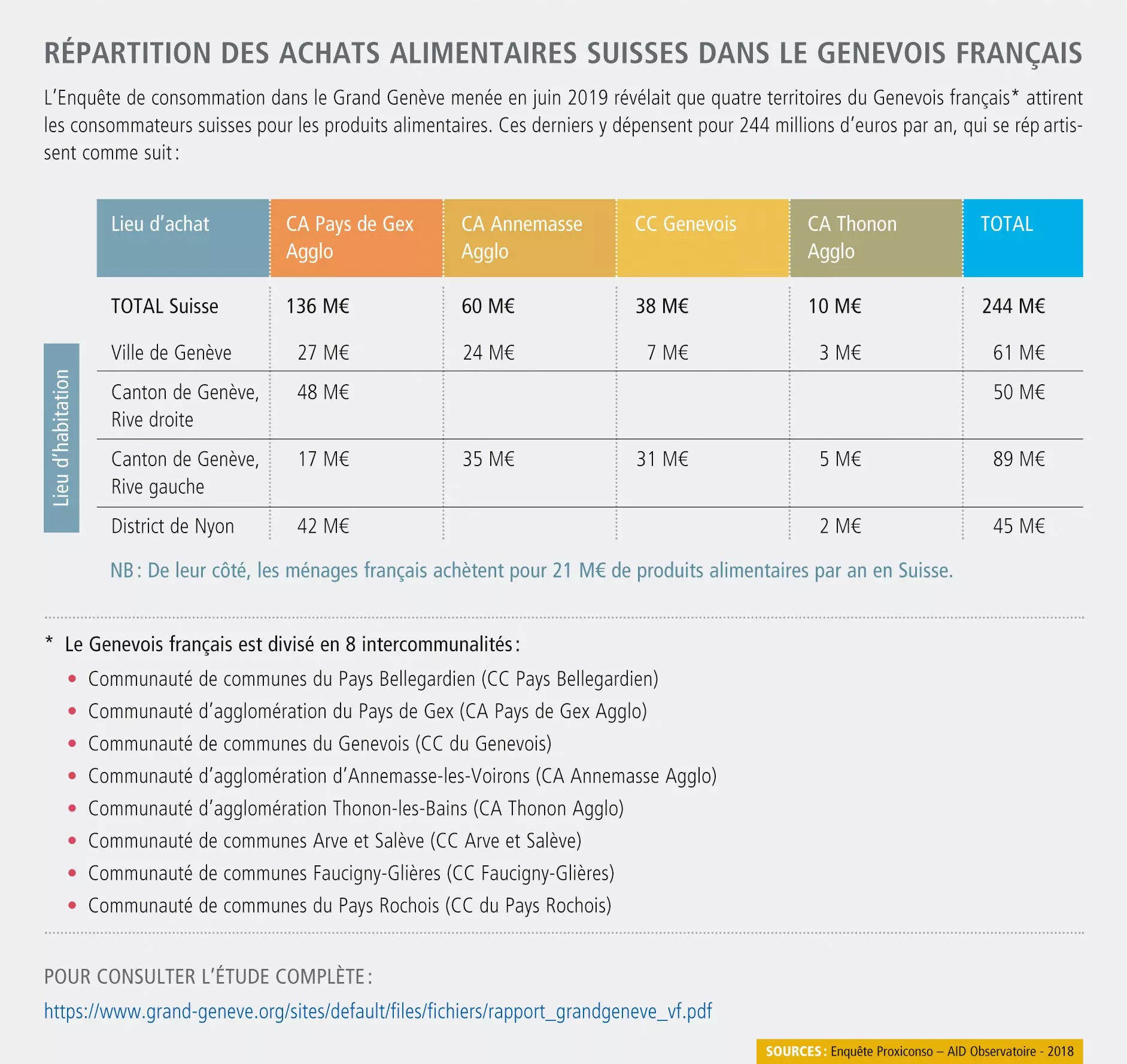 Conduite en 2018 auprès de quelque 6000 habitants du Grand Genève, l’étude « Consommation : les pratiques des habitants du Grand Genève décryptées » indique que la présence d’une frontière et de deux monnaies différentes exacerbe les spécificités d’une consommation par ailleurs caractéristique d’une dynamique métropolitaine classique, de type centre-périphérie. Les commerces des centralités urbaines, suisses mais aussi françaises, sont ainsi impactés par l’importante offre des ensembles commerciaux de périphérie du Genevois français les plus proches de la frontière. Au vu de ses 103 kilomètres de frontière avec la France, le canton de Genève est particulièrement exposé.