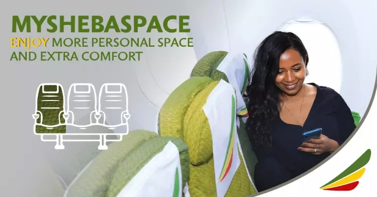 My Sheba Space permet aux voyageurs d'acheter en economy class un ou plusieurs sièges vides à côté d'eux afin de bénéficier d'un espace supplémentaire et de se détendre. MyShebaSpace nécessite une réservation 72 heures avant le vol pour obtenir un siège supplémentaire et est accessible sur le site Web et l'application mobile d'Ethiopian.