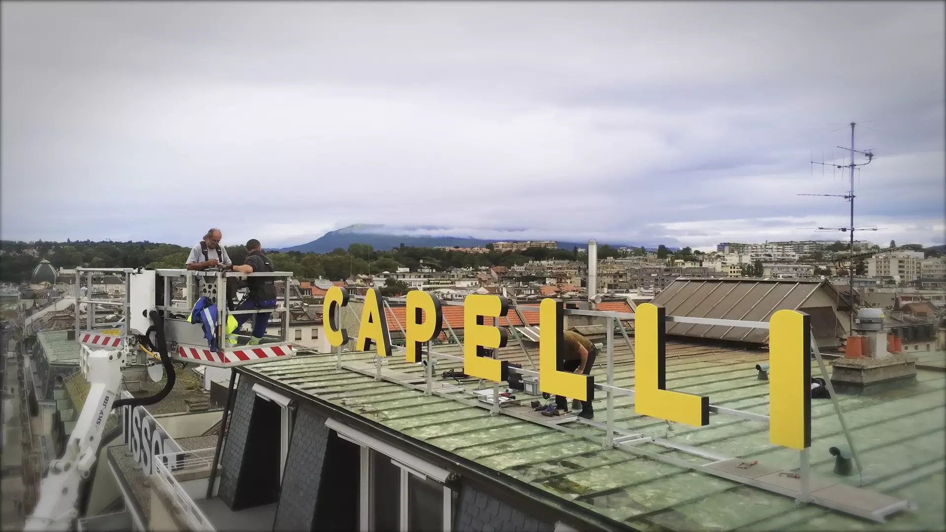Le 26 septembre, il fait gris à Genève, la pluie menace de percer le ciel mais les ouvriers sont à l’œuvre de bon matin pour installer les lettres lumineuses du promoteur immobilier Capelli. L’enseigne prend place sur le Quai Gustave Ador, aux côtés de ses voisins horlogers Tissot et Richard Mille.